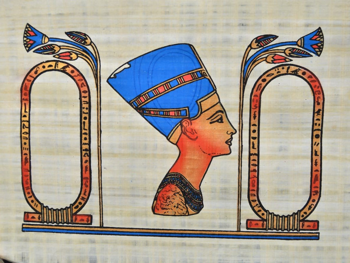 Make your gift truly unique with this custom handmade papyrus artwork featuring the elegant Head of Queen Nefertiti in the center, with space on both sides to add two personalized names in authentic Egyptian hieroglyphs.